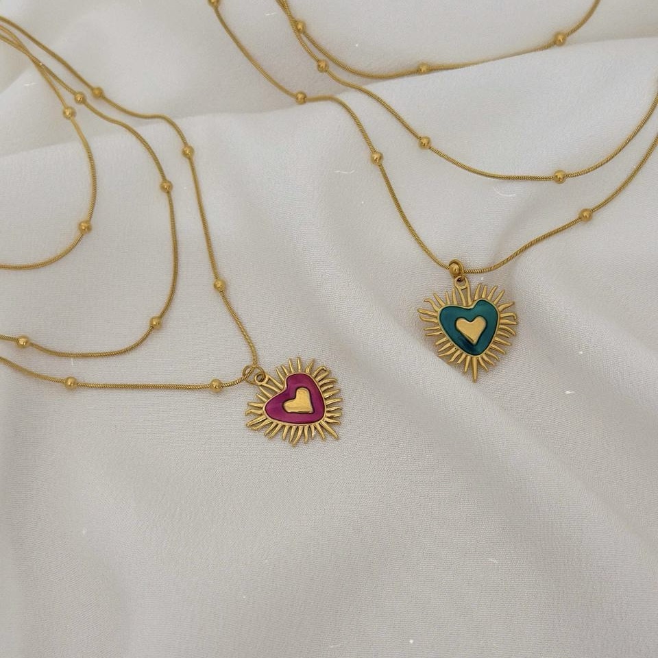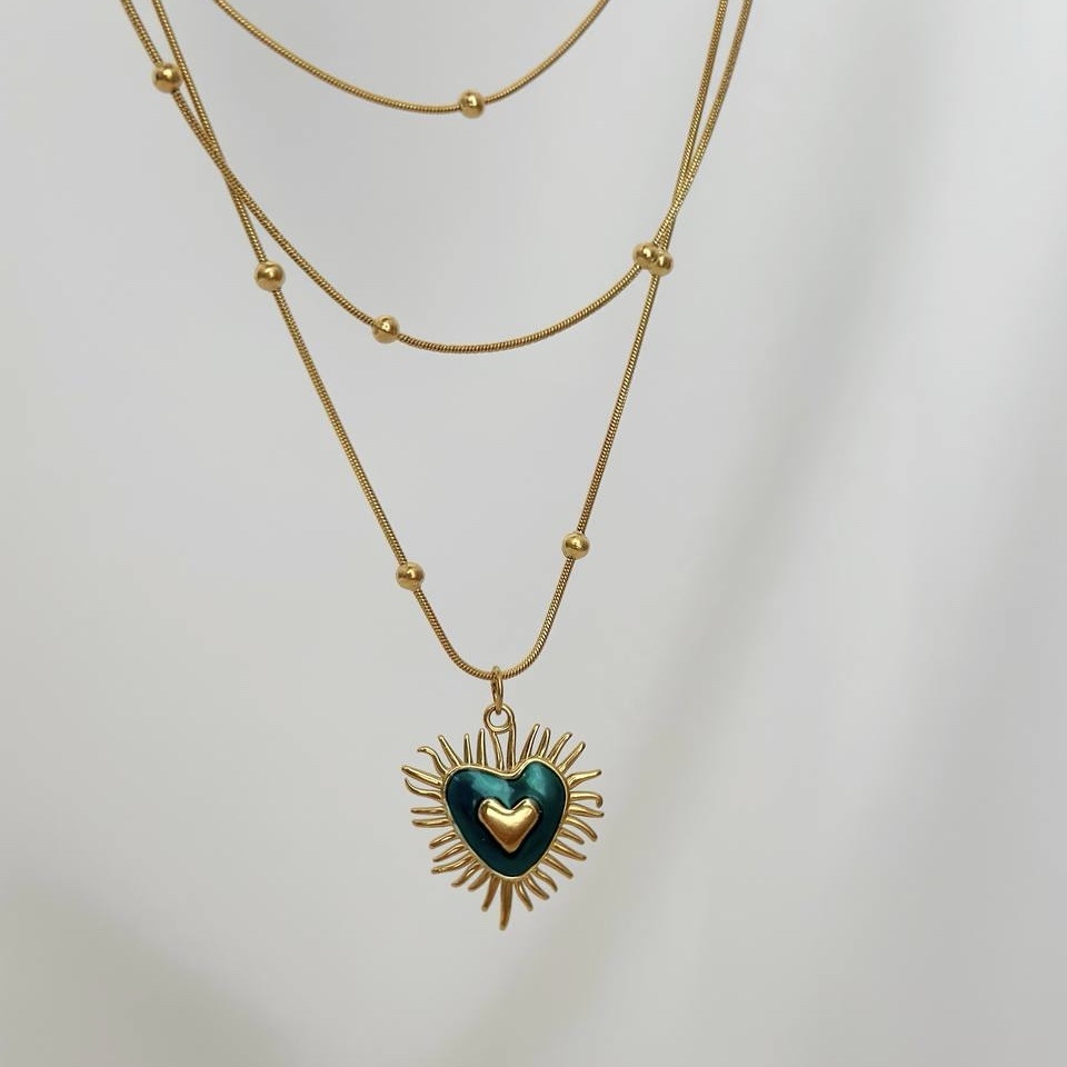 Warstwowy naszyjnik wykonany ze stali chirurgicznej w kolorze złota. Zawieszka w kształcie serca z zieloną emalią i złotym sercem w środku. Regulowana długość pozwala dopasować naszyjnik do różnych dekoltów i stylizacji.