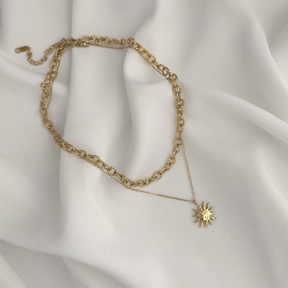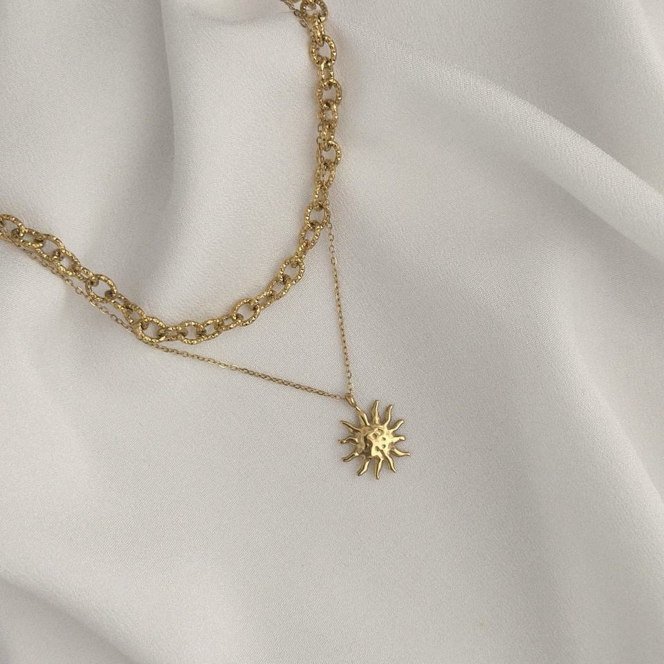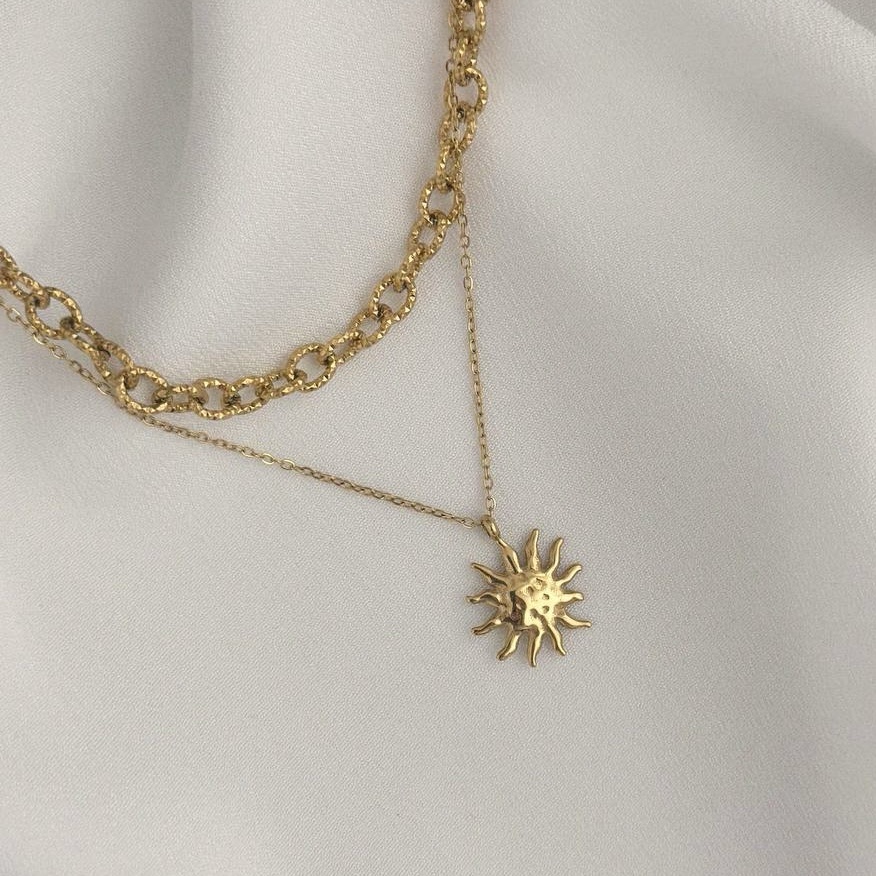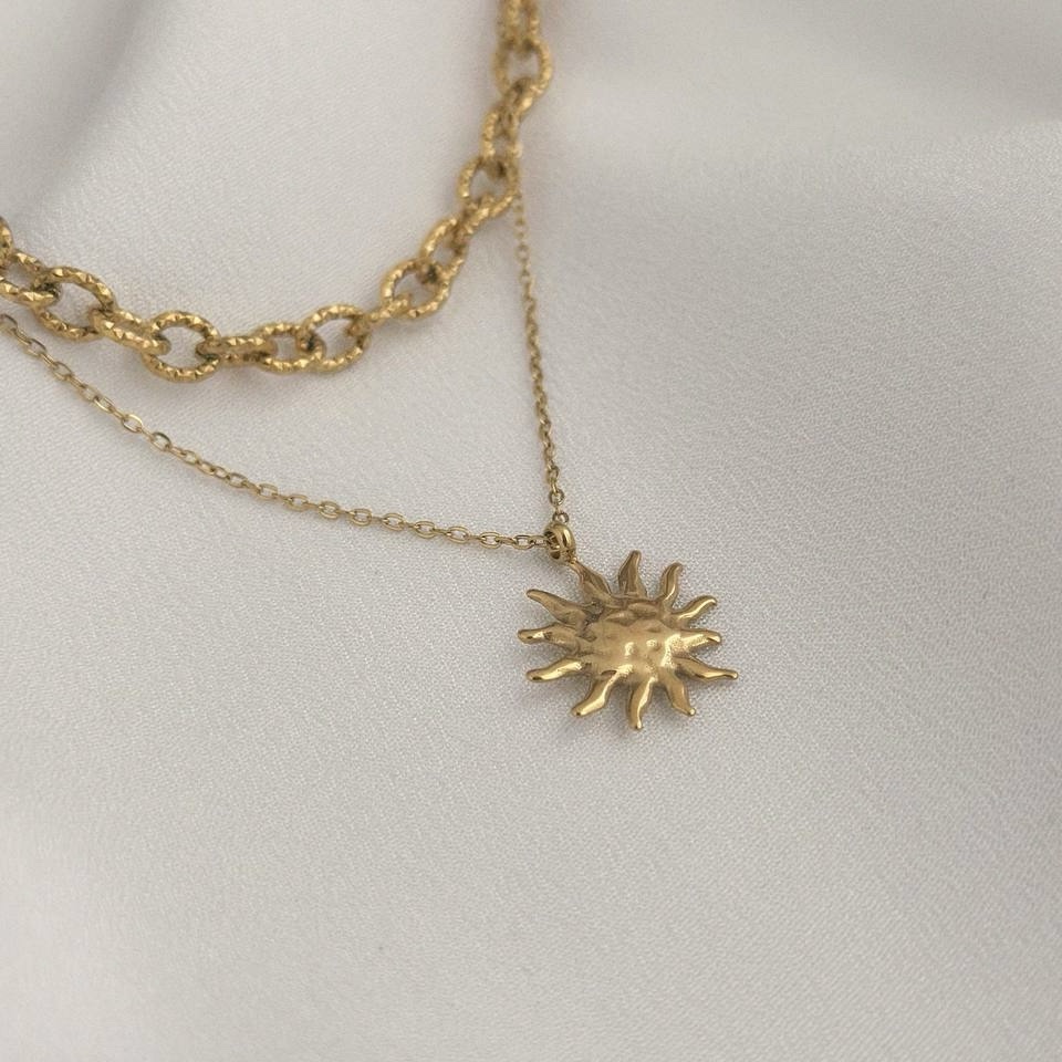 Podwójny naszyjnik, który daje efekt modnego layered look bez konieczności łączenia kilku modeli. Grubszy łańcuszek z dekoracyjnymi węzłami łączy się z delikatnym łańcuszkiem zakończonym zawieszką w kształcie słońca.